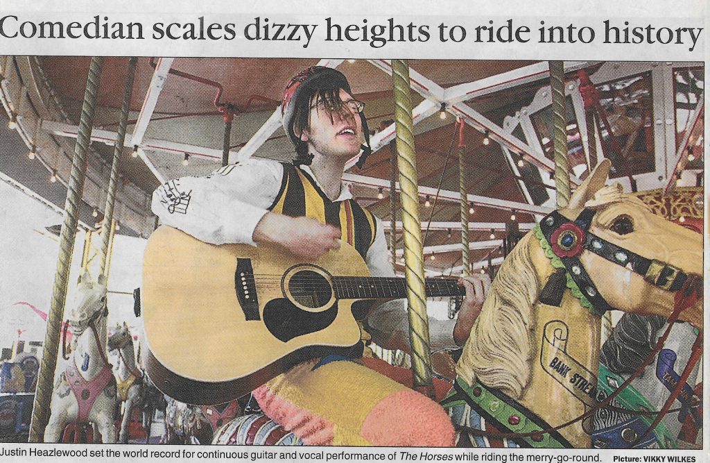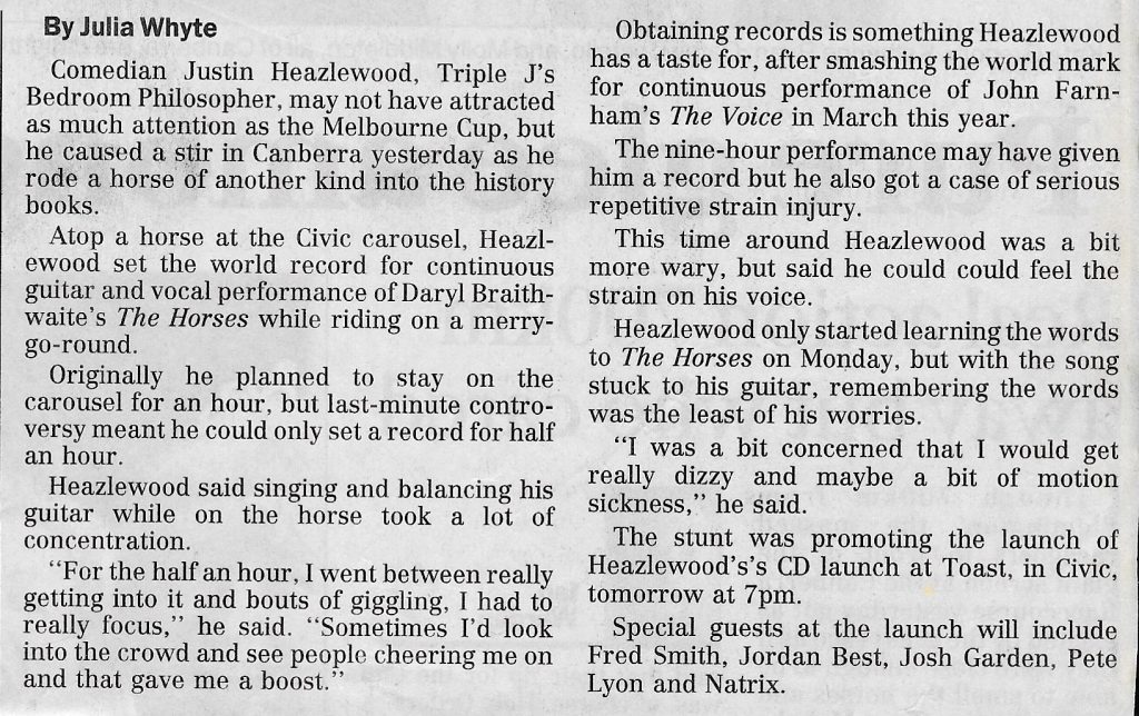 Canberra comedian Justin Heazlewood, (Triple J’s Bedroom Philosopher) will attempt to ride into the history books on Melbourne Cup Day, by setting the world record for continuous guitar and vocal performance of Daryl Braithwaite’s ‘The Horses’ while riding on a horse merry go round.