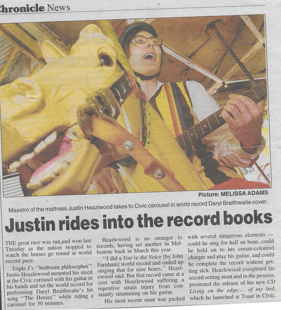 In 2003 I wanted to set the world record for longest continuous performance of Daryl Braithwaite’s The Horses while riding on a horse carousel on Melbourne Cup Day.