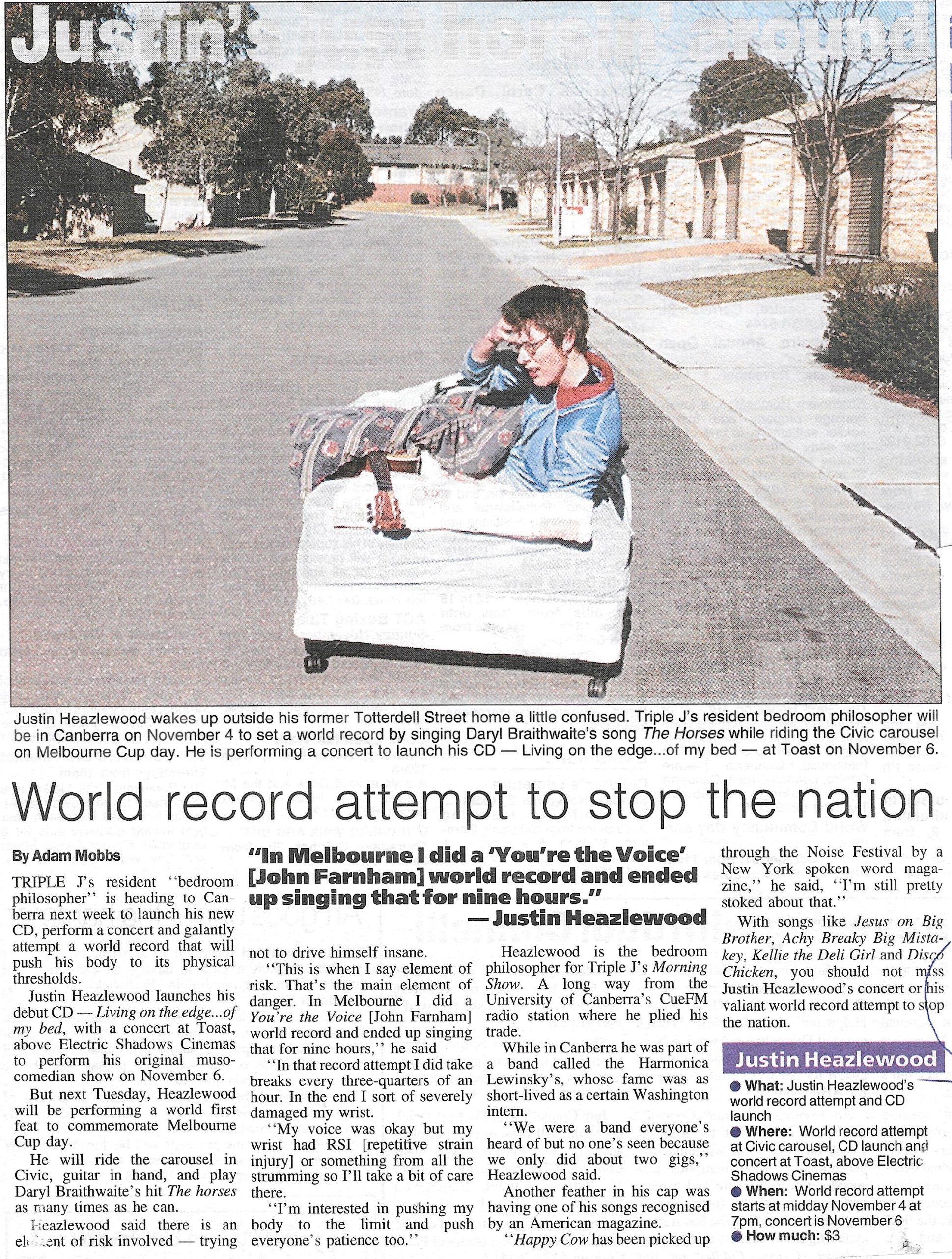 “I had just finished my world record attempt on the civic horse carousel, the humour of which was questioned by ‘elvis’ on the riot-act.com website (are triple j the only people that find justin heazlewood funny…remember, they broke savage garden.) I was feeling a little damaged and introverted and wondering why someone with the nerves of a marshmallow soaked in chamomile tea would expose themselves to the scourer-like glare of the Canberra media and public.”