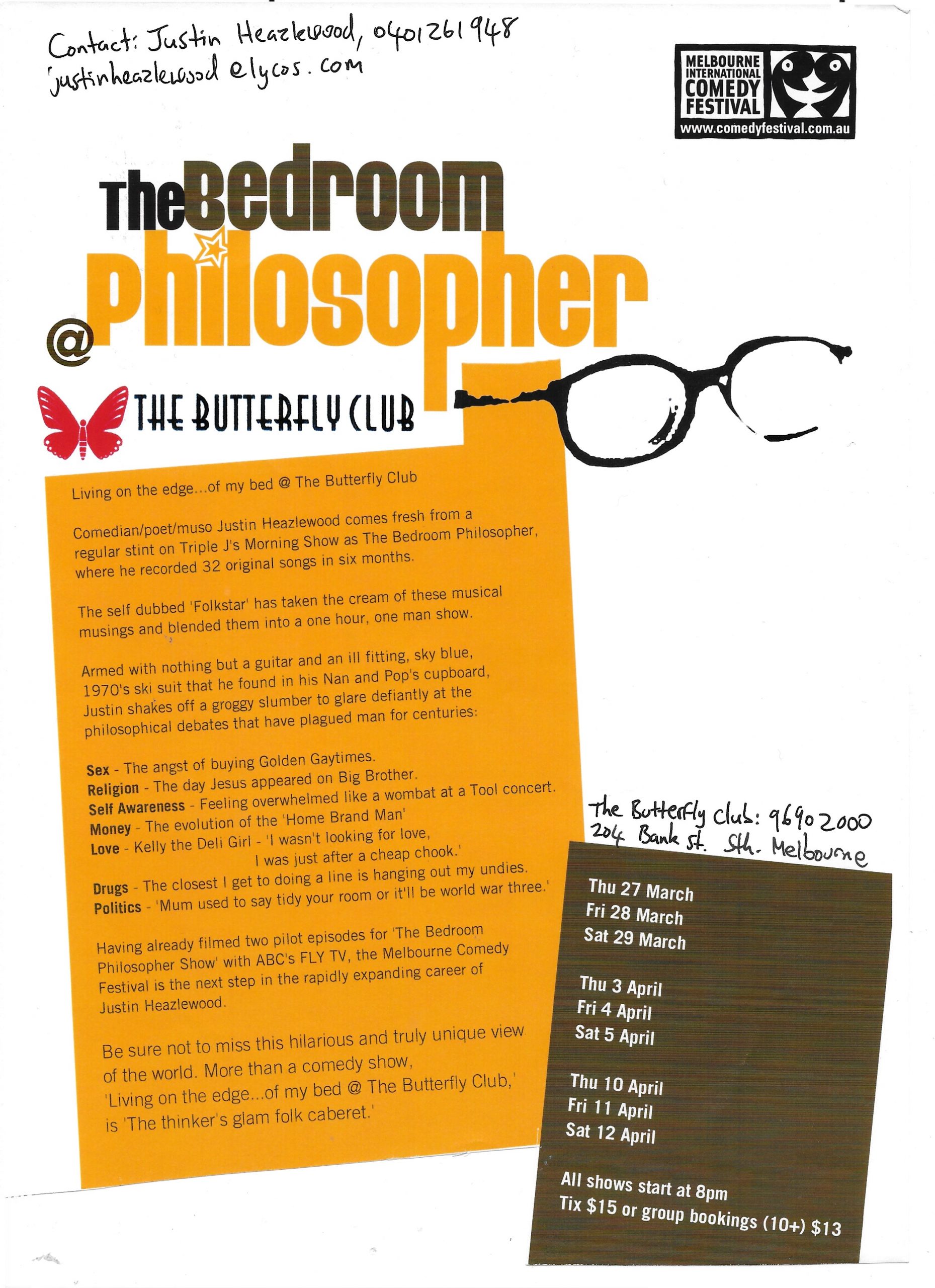 I remember being in Nan and Pop’s bedroom in Wynyard, Tasmania, nervously ringing the Melbourne Comedy Festival office on a cordless phone. I told them who I was and how I’d been on Triple J a bit and how did I get a show going exactly? They said I’d need a venue – but at this late stage it would be tricky. Fortunately, they’d heard that the Butterfly Club in South Melbourne had a spare time slot at 7. I rang the bloke up. He offered it to me. I took it.