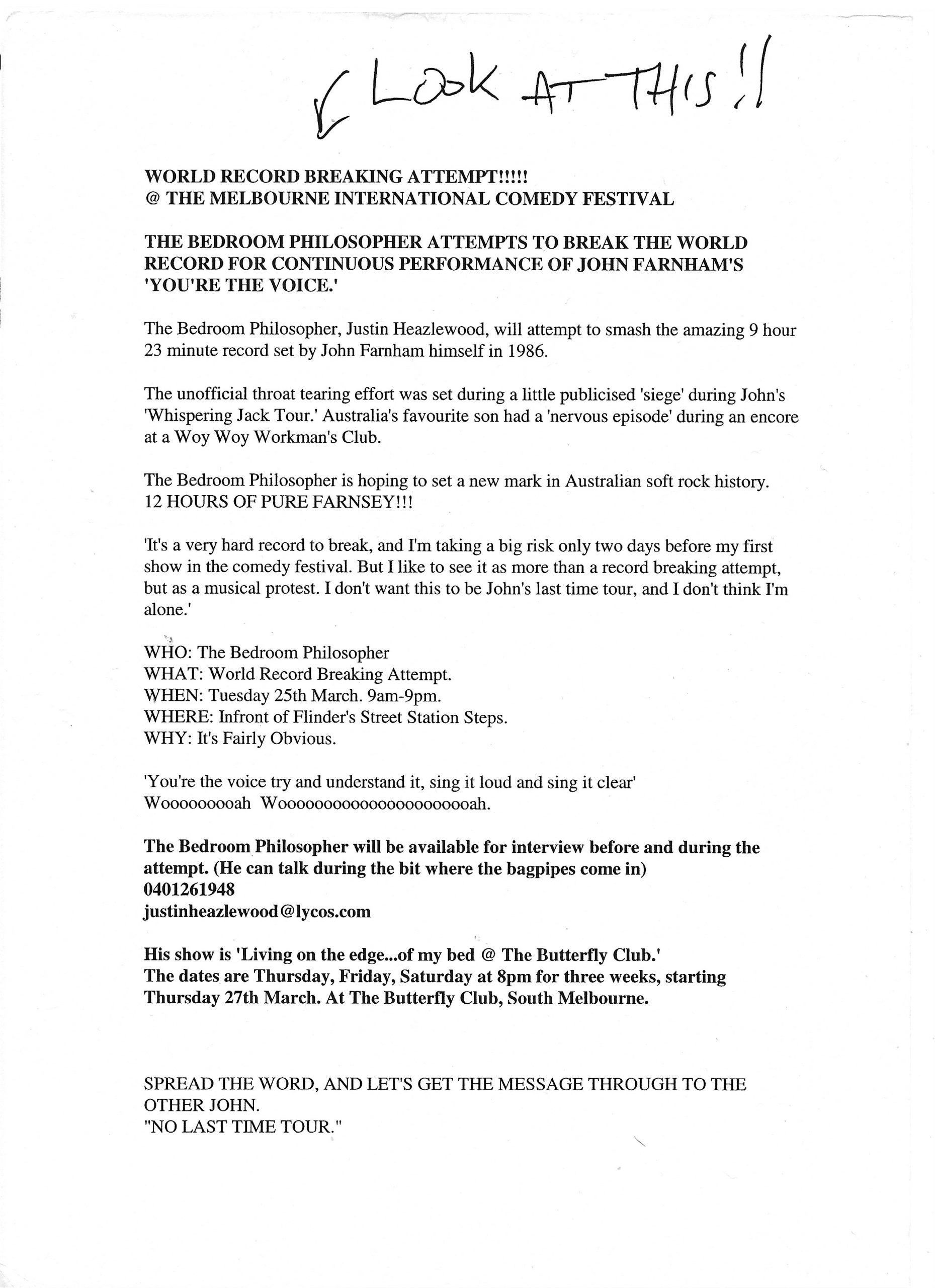 On March 25, 2003 I set the world record for longest continuous performance of John Farnham’s ‘You’re The Voice.’ It was a stunt to promote my debut show in the Melbourne International Comedy Festival ‘Living on the edge…of my bed.’
