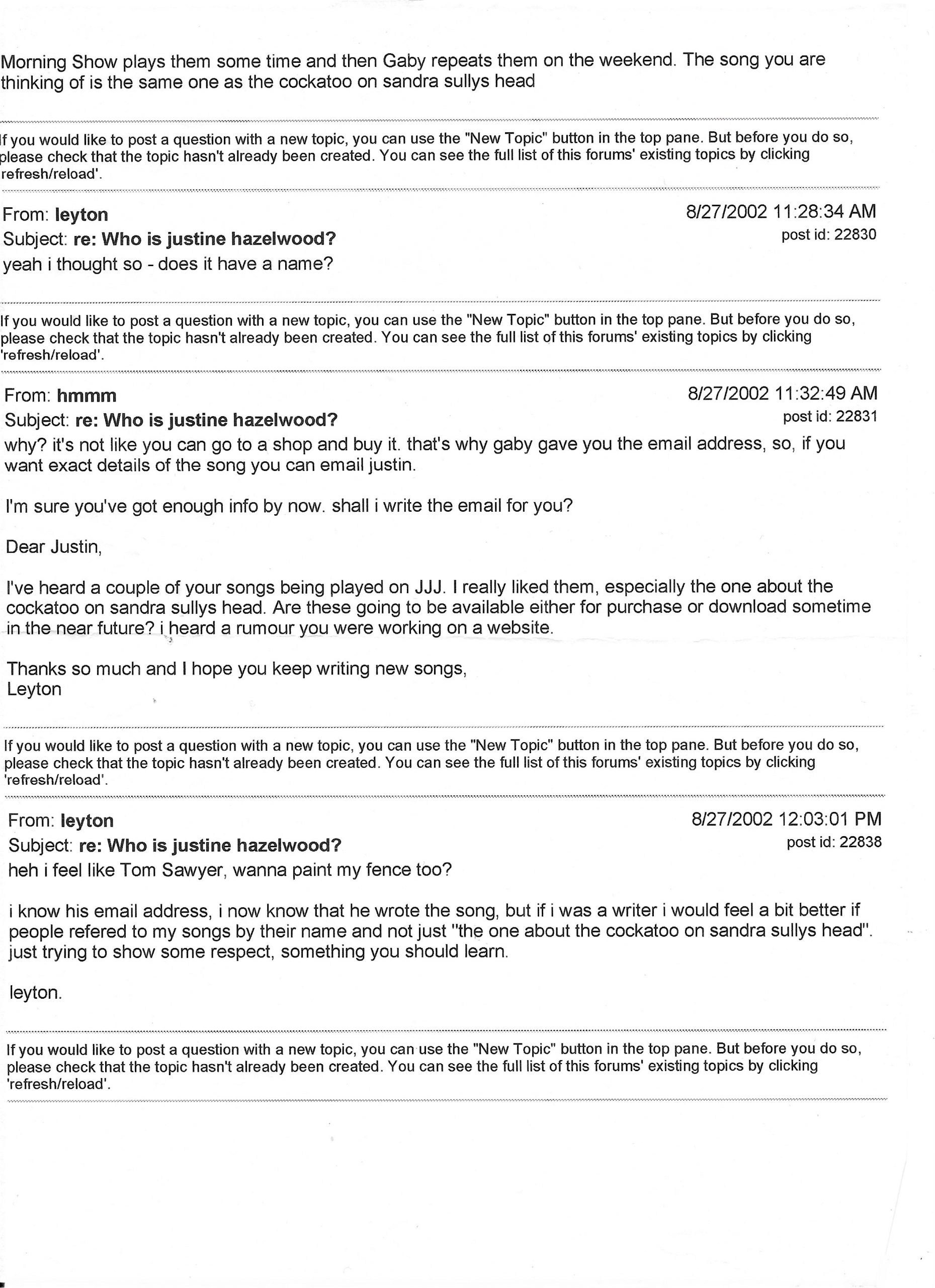 I continued on, suffering headset problems and subsequently throwing a ‘tramtrum’. I flung the infernal gadget onto the cushion and tried to belt out In My day a cappella, which is like trying to sing an opera through a didgeridoo. Precious micrograms of gig momentum escaping from the rupture in my mood, I whipped the headset back on and tried New Media, but sensing exhausted levels of commitment, I aborted all. At this moment two things occurred to me: