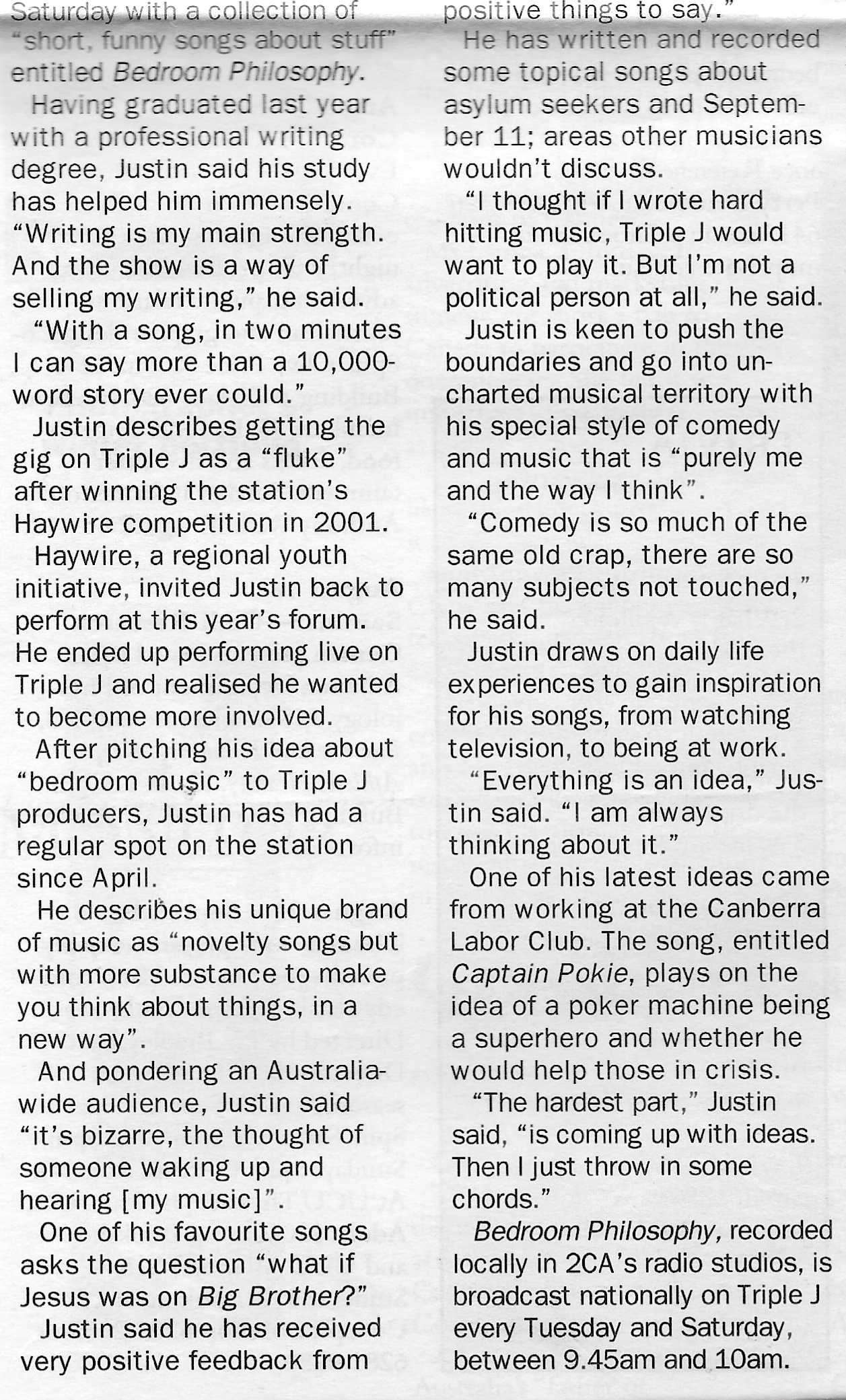 Next up was the spoken word of Man On A Tram. My new friend sprang to life, fishing his wallet from his pocket and showing me a Medicare card. Analysing my code of ethics, I was cautious to engage him. I fixed my gaze to the middle distance and finished the tune. Throwing caution to the air conditioning, I beamed.
