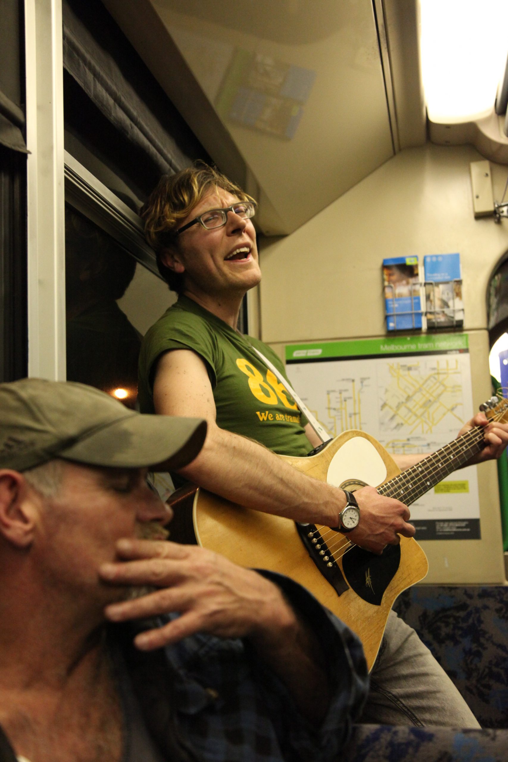 I banged through the tunes, finding the subtler ones like Sudanese weren’t helped by the grumbling din. Tips for performing on a moving vehicle? Yoga really helps with your sense of balance and core strength when riding the bumps. By Bourke Street the tram was squashy from Friday night revellers, and feeling weird about the stares, I bailed on Trishine. Señor Tram Driver was still running the show, threatening to turn the thing around unless people cleared the backdoor. I tried to capture the moment by starting a sing-along along the lines of “please clear the backdoor” set to three chords. There’s nothing more vulnerable than walking off a tram you’ve just performed a hit and miss improvised song on while teenage punks diss you via the insta-parody “Please, get the fuck off the tram.”