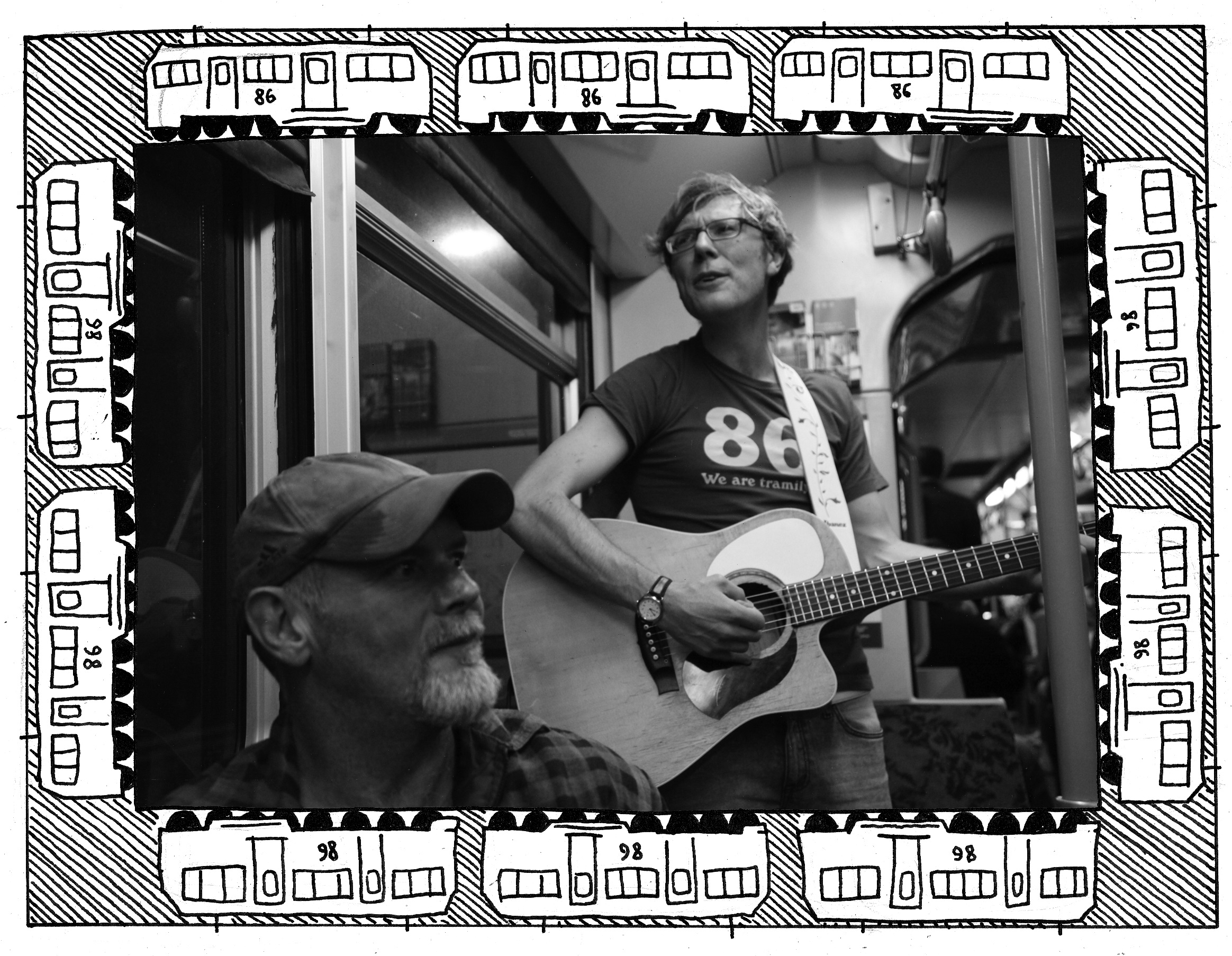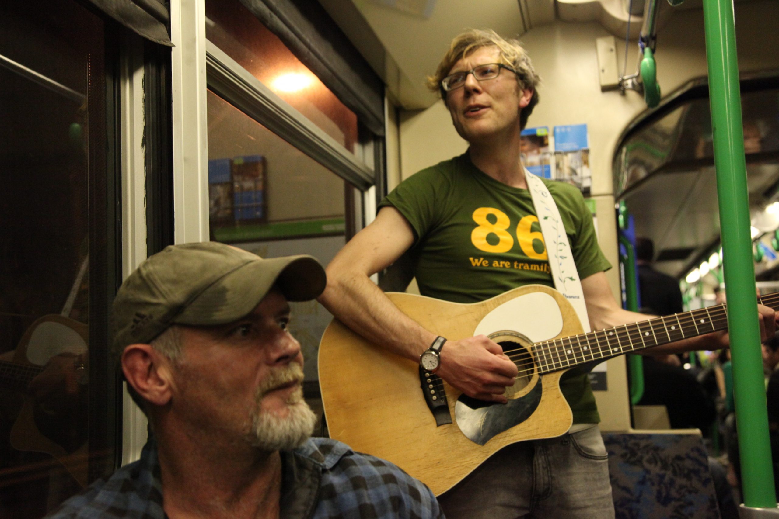 In November 2010 I was booked by Melbourne Music to perform some shows on the 86 tram (along with a certain Courtney Barnett!). This involved me straddling the gap between two seats, leaning against the back window for support while wearing a radio headset mic hooked up to a small amp. On two occasions I attempted to perform Songs From The 86 Tram in its entirety. The first time the tram rolled out from Docklands to Bundoora – the opposite direction to the album. It was suggested that I could have performed the songs backwards, (reverse order, not phonetically) which was a neat idea. On a blustery Thursday eve a medium coterie of fans turned out, scoring their weekly tickets well in advance. The 86 is a venue that doesn’t need a lot of people to look full.